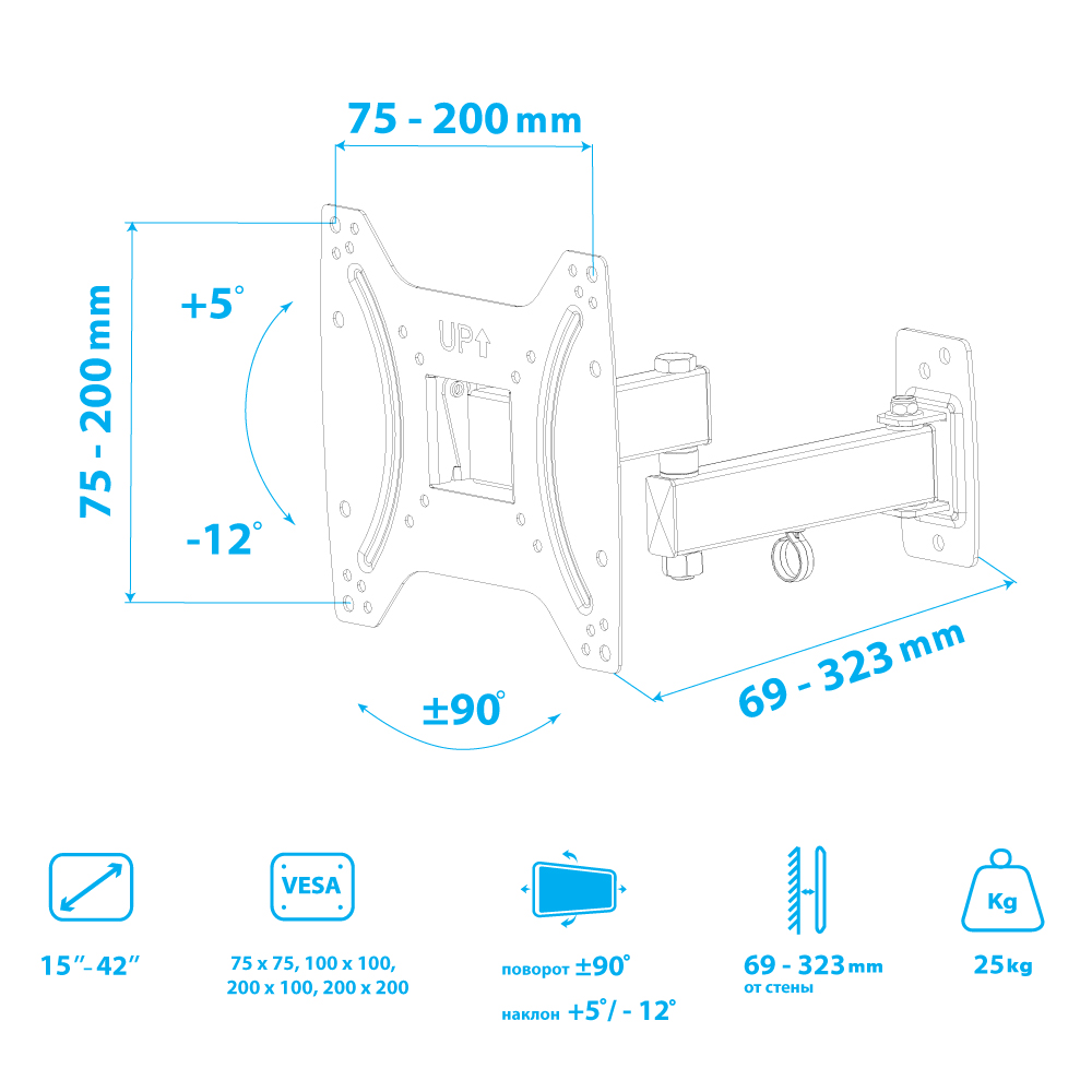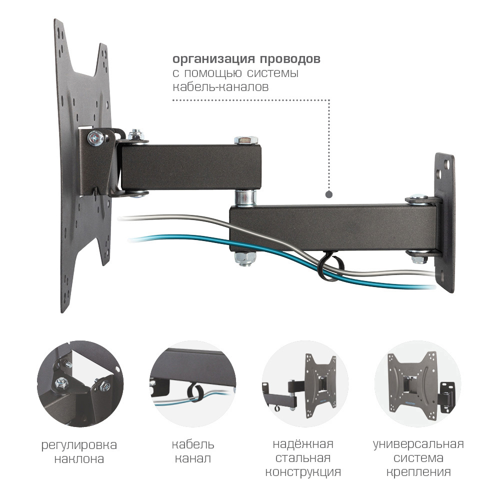 Надежная стальная конструкция, Легкий монтаж телевизора, Универсальная система крепления, Кабель-канал |