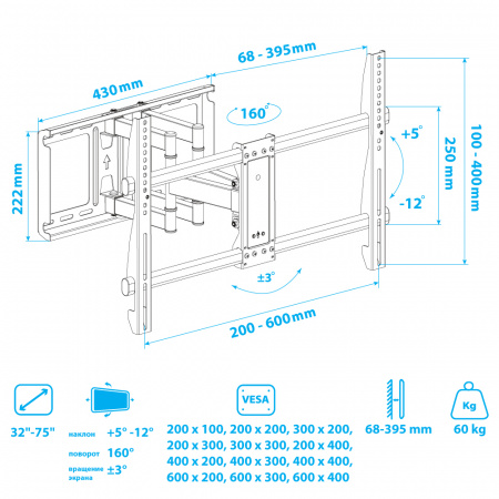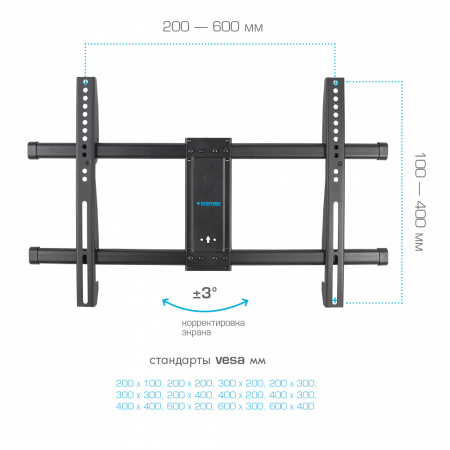 Усиленное настенное основание - широкая монтажная пластина обеспечивает надежное крепление ТВ на стену, надежная стальная конструкция - максимальная нагрузка до 60 кг, универсальная система крепления, лёгкий монтаж при помощи съемной монтажной пластины, корректировка экрана - уникальная возможность вращения экрана на ±3° относительно стены |
